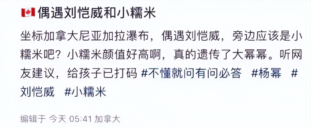 该网友还称小糯米颜值很高,完全遗传了杨幂。而为了保护孩子的隐私,她也给小糯米的面部打了马赛克,大家只要想一下杨幂的脸就大概猜到孩子的长相了。虽然大伙儿无法看到小糯米的长相,但是从身材比例上也能看出杨幂的影子。