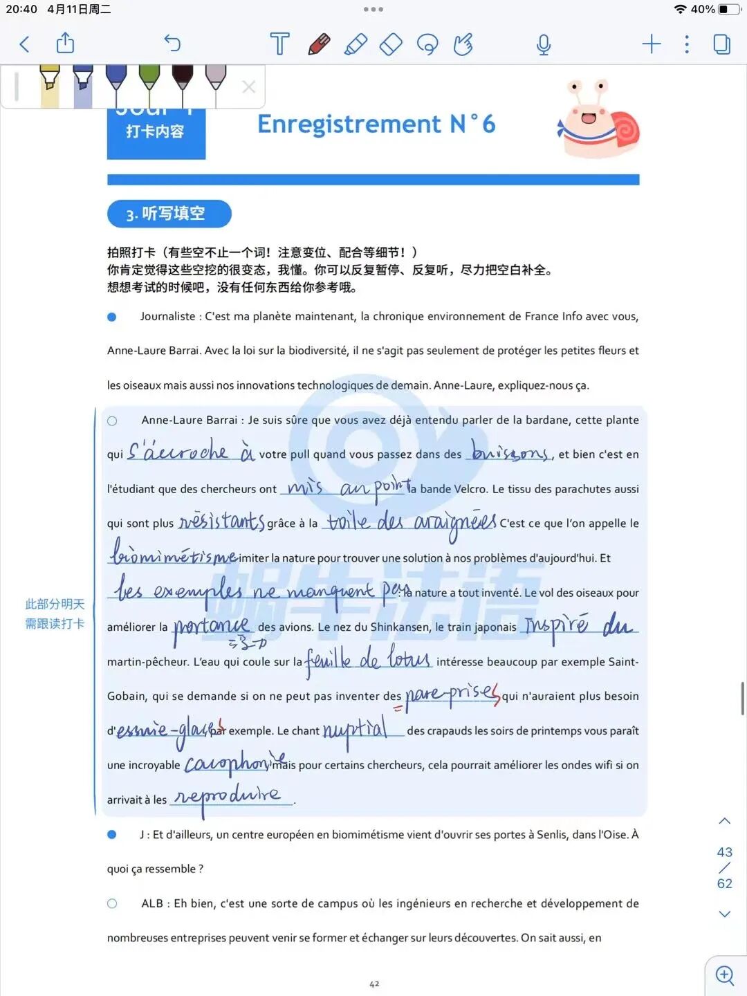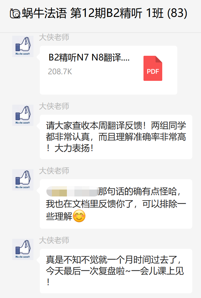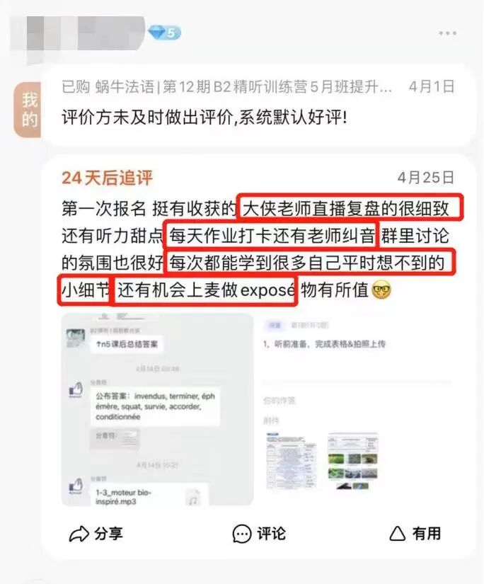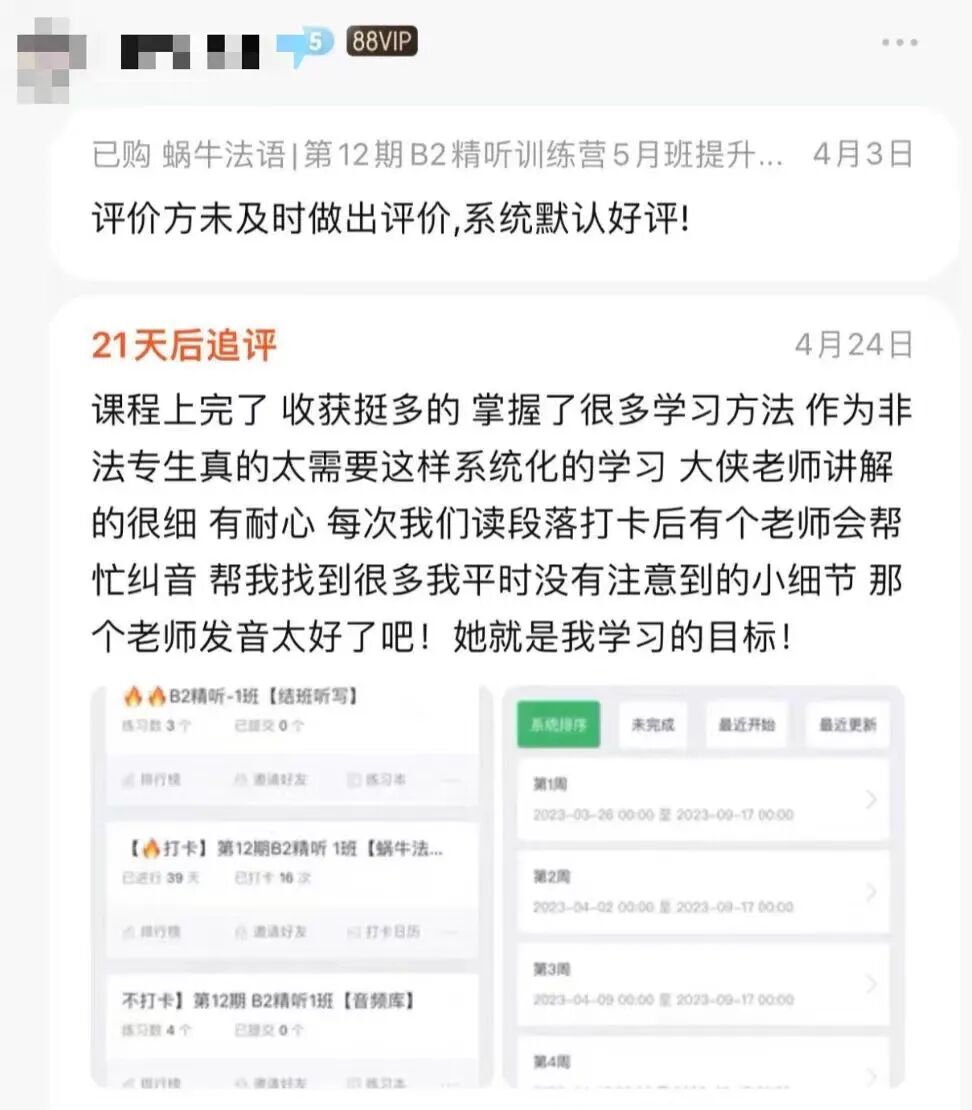 截图来自蜗牛法语淘宝官方旗舰店、以及11期B2精听训练营B班结班问卷更妙的是,B2精听5步法不仅可以提高听力水平还对法语口语发音有帮助!一起欣赏下学员打卡的录音作业吧??