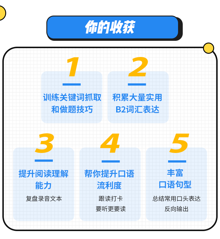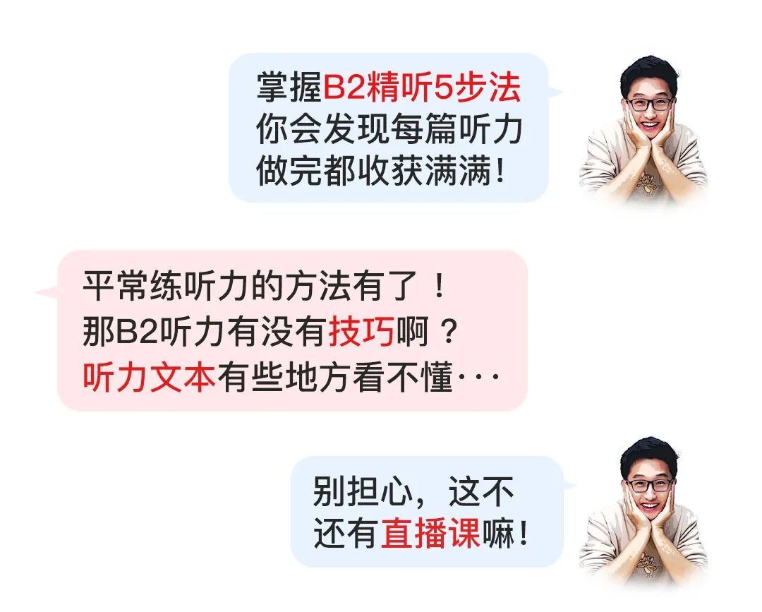 不管你是听力薄弱,还是想参加B2考试亦或是低分飘过B2计划冲C1只要处于B1级别以上,就可报名??