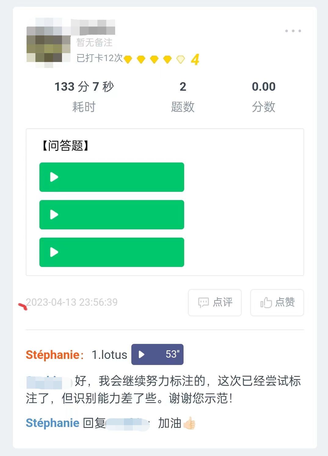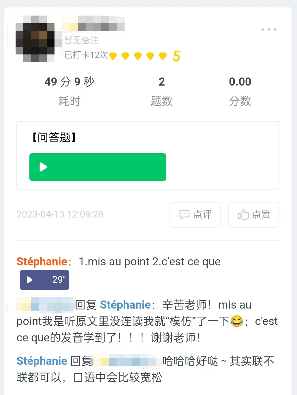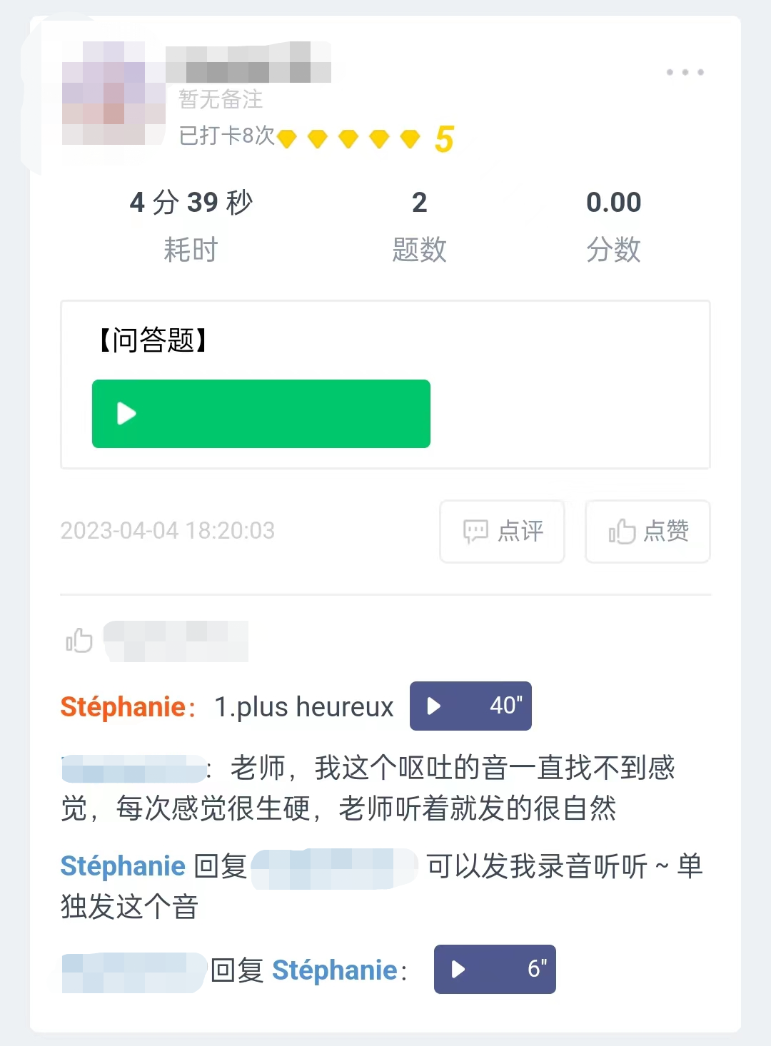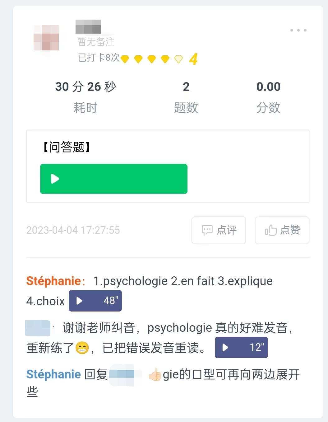 1V1 评分反馈、细致纠音?左右滑动图片查看更多?图片来自第12期B2精听训练营学员打卡这一过程不仅可以发现自己的语音问题提高法语口语流利度甚至还能培养出传说中的语感