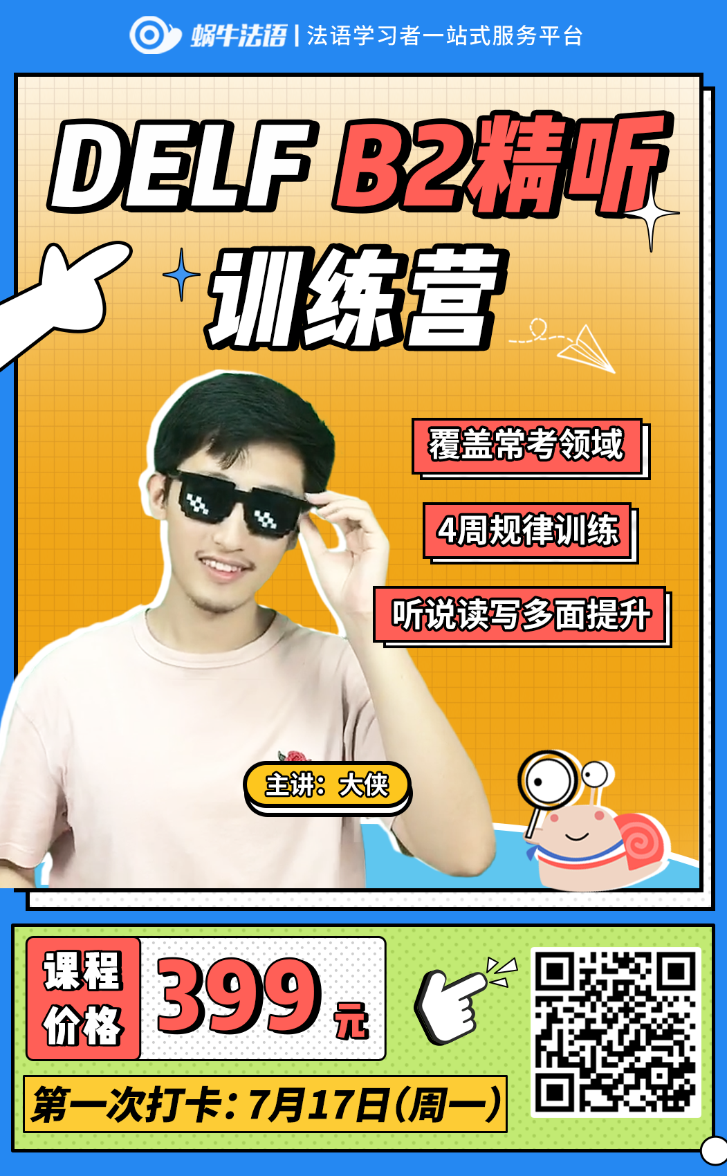 第12期 B2精听训练营覆盖DELF B2八大常考领域讲义中的长、短听力题目是从原版听力教材、模拟题精选浓缩而来的!B2听力怎么考,咱们怎么练!
