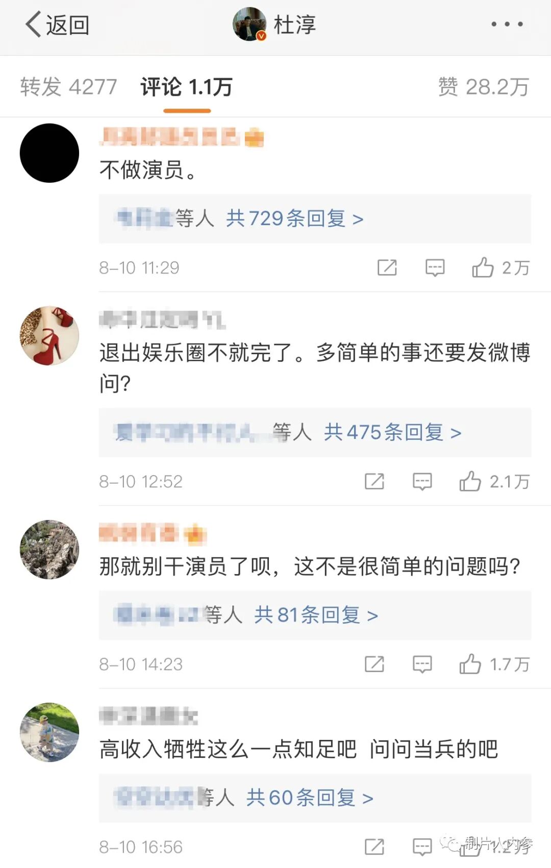 屡见天价片酬、阴阳合同等娱乐圈恶劣事件的发生,这届网友根本不接受明星“卖惨”。除了粉丝控评的内容,评论区里的高赞热评简单明了地对杜淳的问题作出了“解答”:建议退圈。
