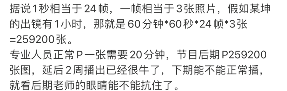 再想想其中的辛酸和苦楚,也是着实心疼这些后期工作人员们。有网友换算了一下,节目一期两个多小时,如果蔡徐坤的镜头只有一小时,60分钟转换成帧数再转换成照片,就要P整整25万张照片!