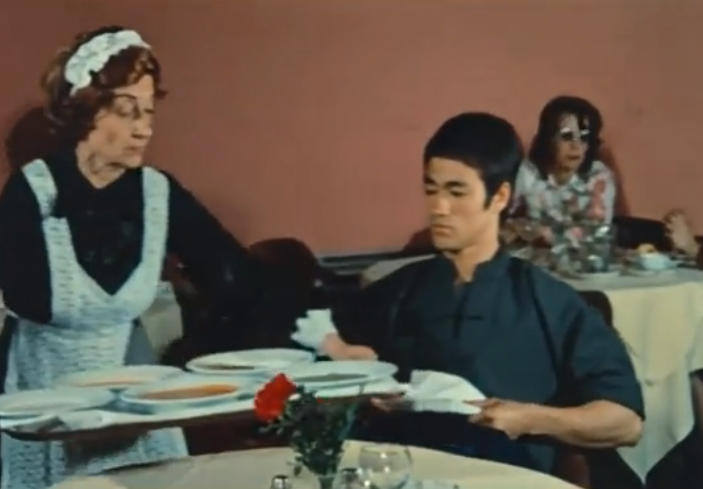 影片中,李小龙饰演的唐龙是一个远赴海外的中国青年,开头就因不懂外语而在餐馆点了一桌子汤,让人啼笑皆非。