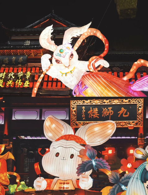 在多媒体灯彩艺术的创新加持下,书卷中的《山海经》宇宙便跃然于豫园之中,一幅梦幻的上古神话图卷“山海奇豫记”亭台楼榭之中徐徐展开。九大篇章精彩纷呈,在这场绮丽山海的“国风派对”中,深度感受“山海奇豫”的中华传统文化大美,身临其境体验一段奇幻旅程。为了迎接兔年的到来,灯会中不仅兔元素满满,而且官方限定兔子花灯更是让广大游客们高呼可爱绝绝子。