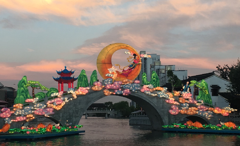 在《金山县志》中,可以看到“街市结棚张幕,悬灯挂彩,金鼓管弦,火树最盛,游人往往达曙为常”、“立春后放风筝,夜以灯爇烛悬线而升,有烟火飞如繁星”等与花灯相关的记载,处处可见熠熠生辉的灯影。现如今,在中秋等节日,朱泾各社区、学校沿袭旧制,采取传统工艺制作各式精美花灯,沿市河等地悬挂,再现“千门灯火依如昼,月影阑珊醉珠溪”的节庆景观。