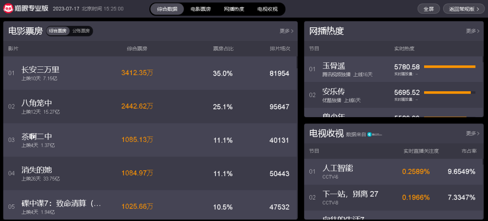 截至7月17日下午15时25分,从“猫眼专业版”实时数据显示可知,当前热映电影票房榜前五分别如下: