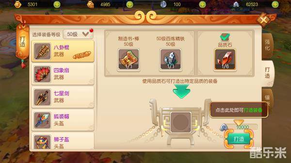 打造装备是最高端大气的获得装备方法,毕竟什么也比不上自己打的装备更顺手了。打造装备也是唯一一个获得极品装备的办法。集齐图纸和精铁就可以打造装备了,如果再辅以橙色品质石,就能打出更极品的装备,例如加上紫色品质石打出的必然是紫色以上的装备,加上橙色石则必出橙装!