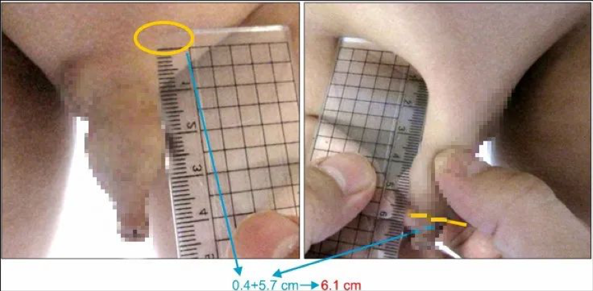 第二步:沿着小鸡鸡上面,用量尺测量小鸡鸡根部与龟头顶部的长度,注意不包括包皮长度。