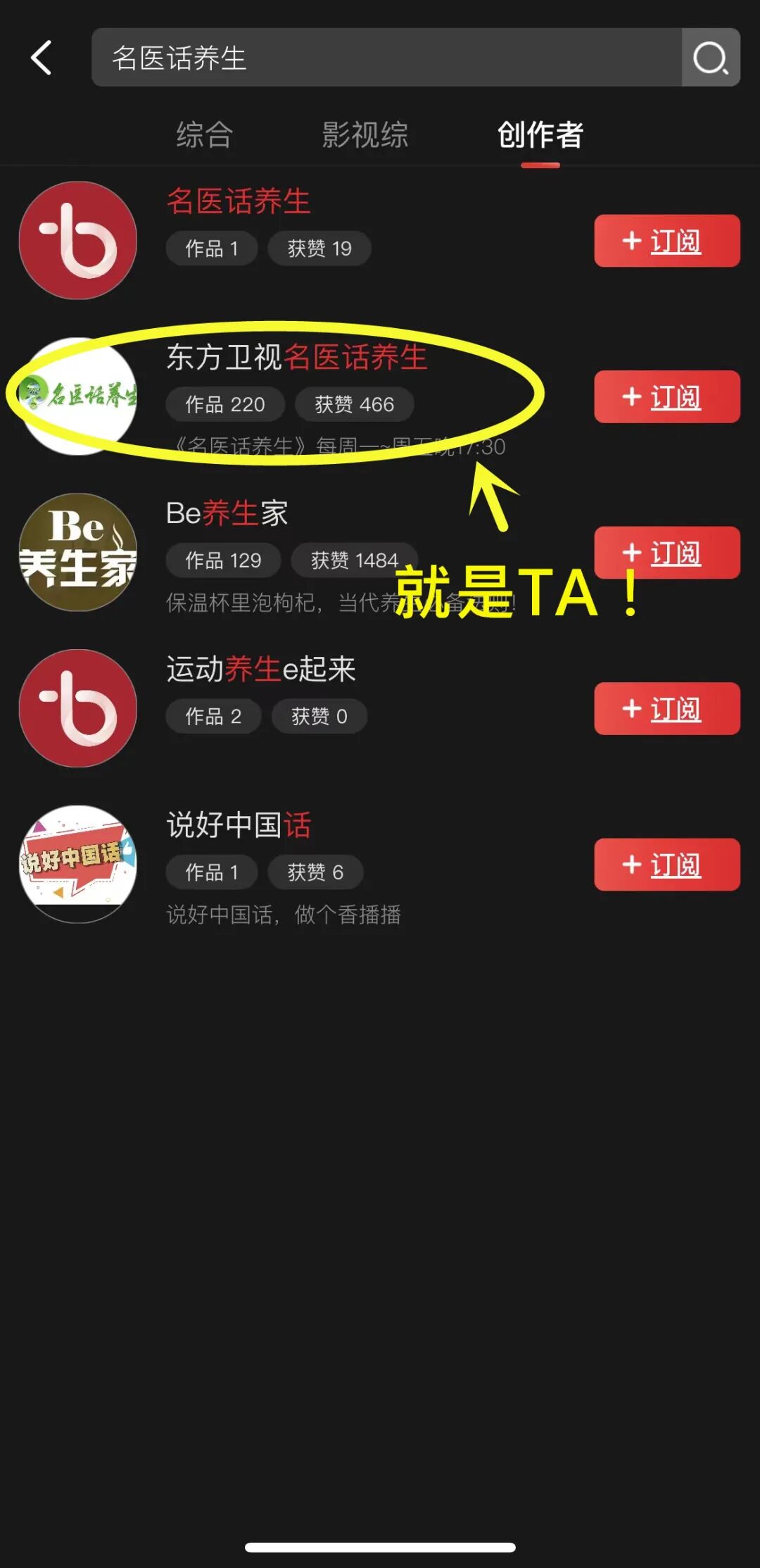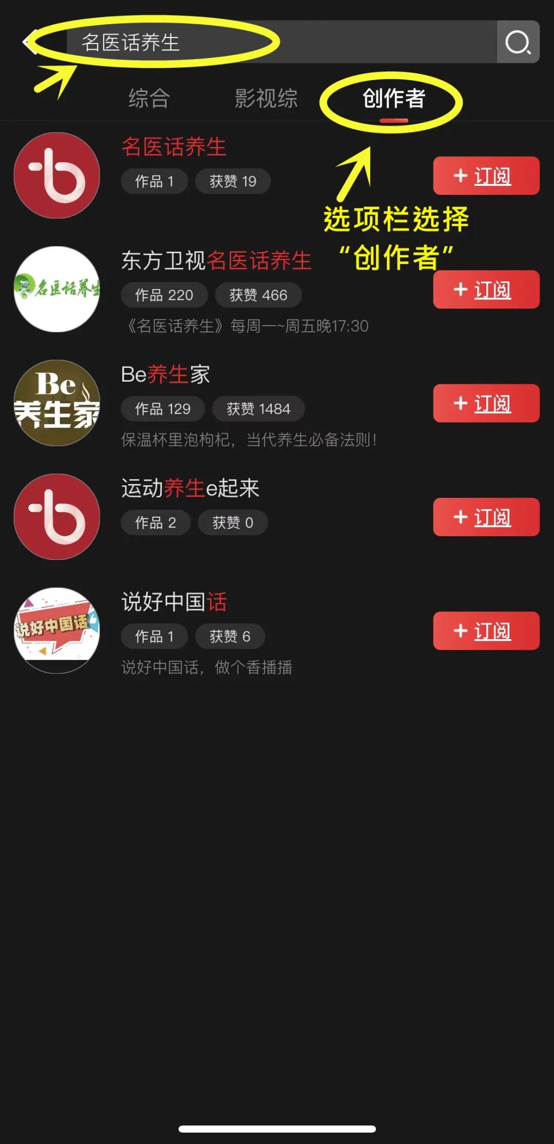 ■ step2:进入搜索页面后,在搜索栏中输入“名医话养生”并选择“创作者”选项,进行搜索后会出现与之相关的栏目列表。↓↓↓