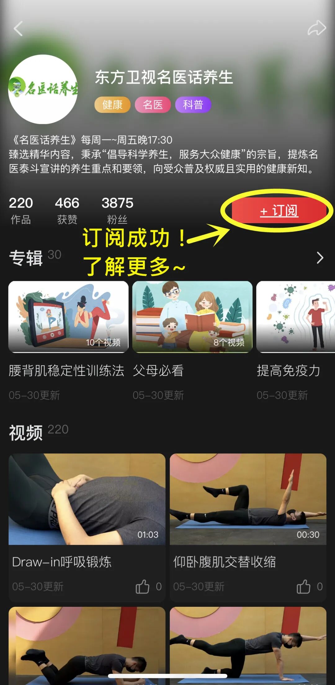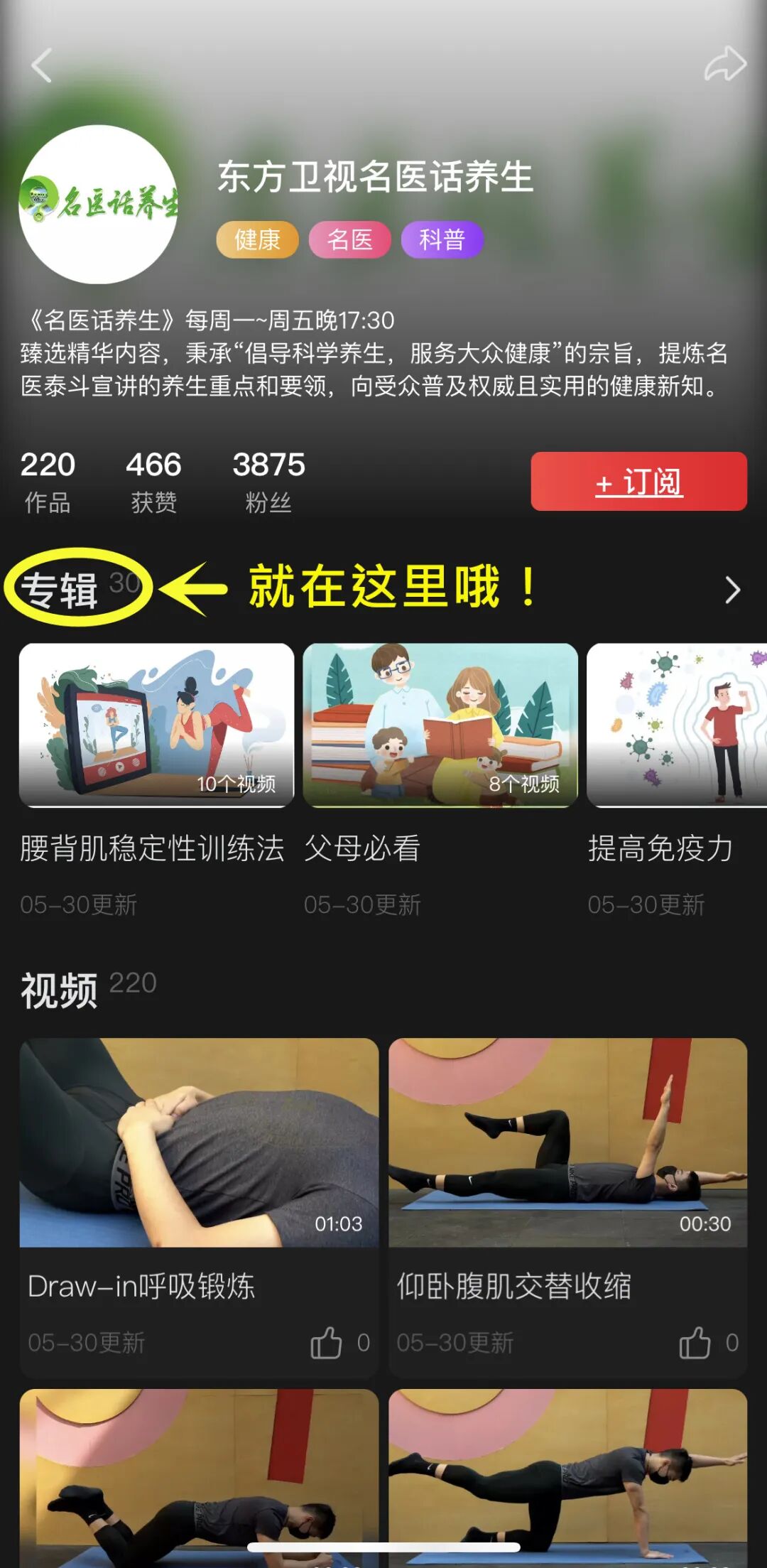 ■ step4:进入《名医话养生》栏目专属页面,迅速点击“+订阅”,即订阅成功!↓↓↓