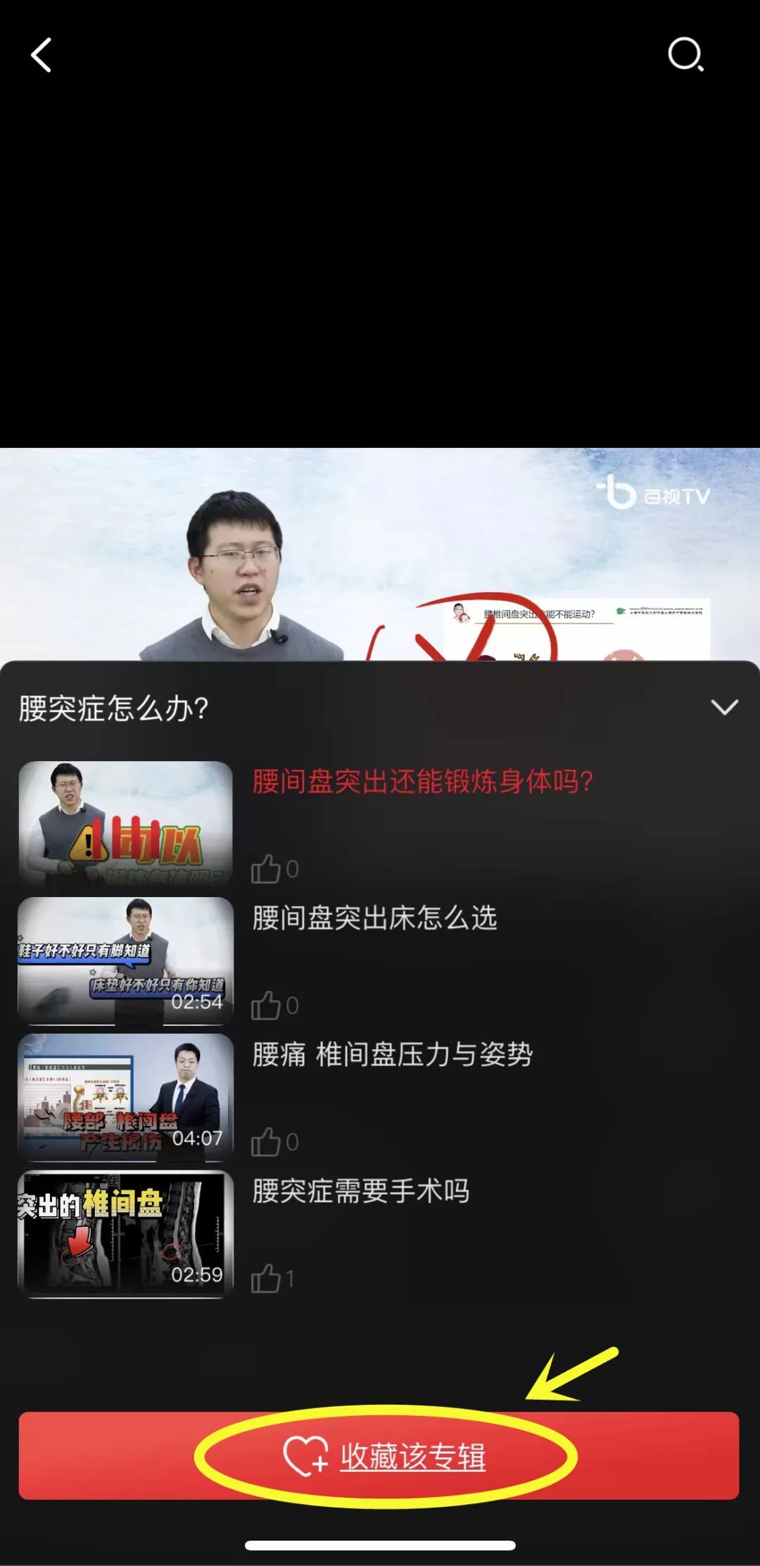 ■ 举个栗子:选择“专辑列表”中的《腰突症怎么办》后,会出现弹话框, 只需点击下方红色按钮“收藏该专辑”即可!↓↓↓