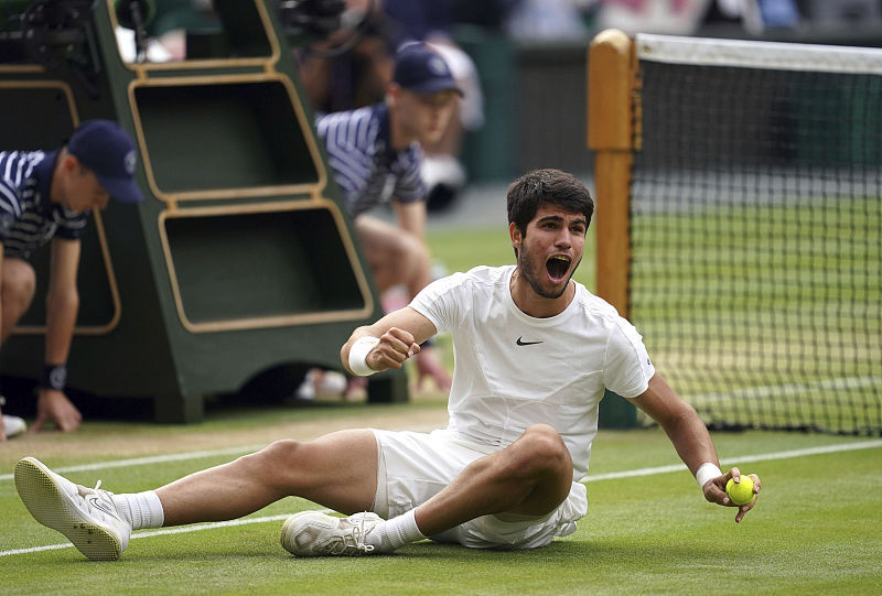 时钟走过了4个小时,“一老一小”进入了决胜盘,胜利天平悄然向阿尔卡拉斯倾斜。德约凌空击球失误错失破发点,也失去了最后的机会。阿尔卡拉斯完成破发后,不断扩大着优势。来到发球胜赛局,阿尔卡拉斯毫不手软,用强势发球带出冠军点。6比4,20岁的阿尔卡拉斯锁定职业生涯第一座温网冠军奖杯,也是他的大满贯第二冠。