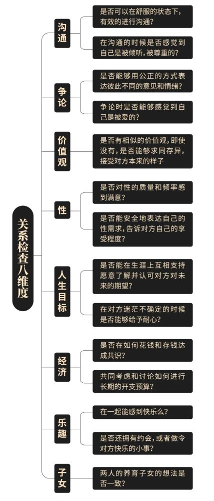 当你在思考自己和伴侣的问题到底出在哪里的时候,你可以使用“关系检查八维度”工具,通过它你可以知道你们的关系究竟哪些方面好,哪些方面不好,找到问题所在,建立和保持健康的关系。