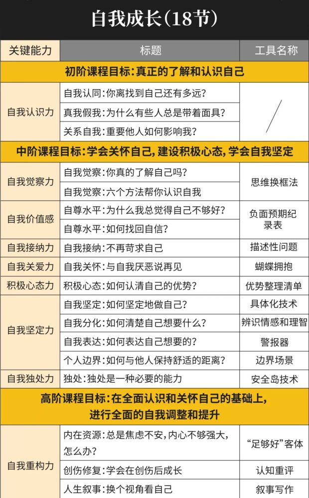同时,课程基于一线用户真实的发展缺失与生活困境,依托自研的成年人发展理论框架,高度结合生活实景,让你了解这些心理能力如何影响你的生活,最终能够将所学运用到自己的人生中,实现快速、高效地自我提升。
