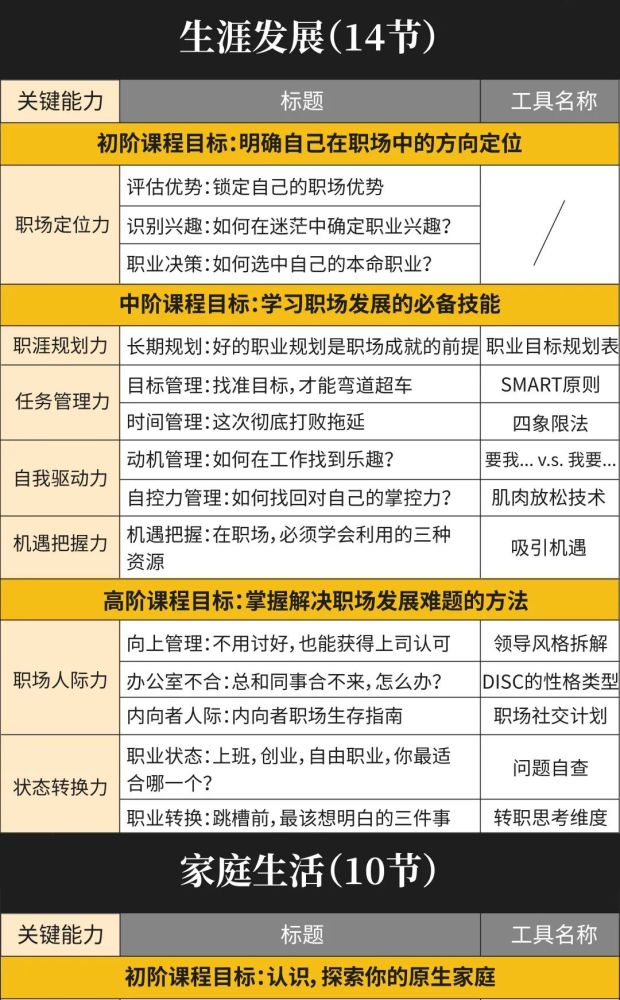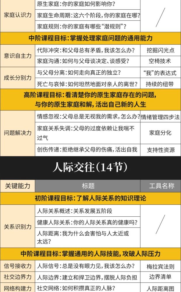 人生必修课针对的是成年初显期及早期(18-35岁)的朋友们,它涵盖了6大人生议题,通过使用80个实用心理学工具,使人们在成年人阶段,应当在各个方面发展出的43种心理能力得到全面提升。