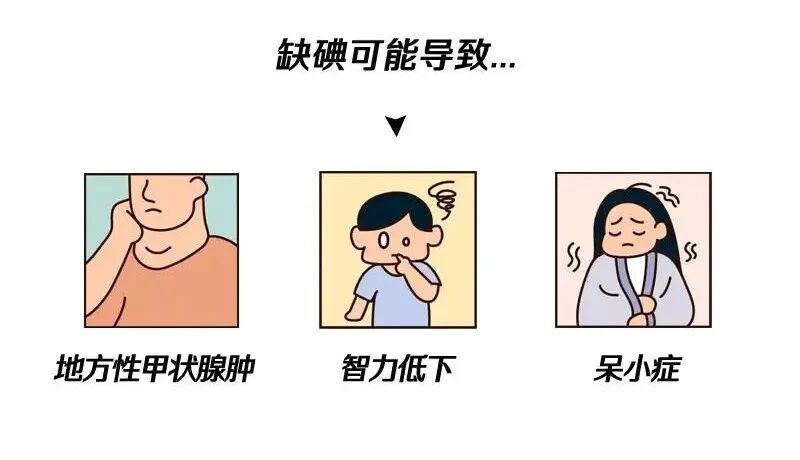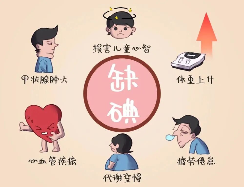 成年人缺碘可能会导致甲状腺功能低下,容易疲劳、精神不集中、工作效率下降,甚至甲状腺肿。{补碘至关重要}