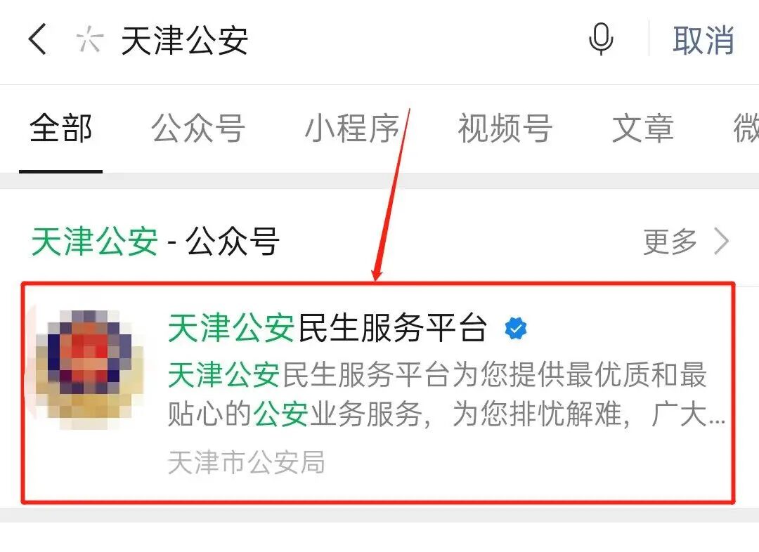 第一步,微信搜索“天津公安”,并关注“天津公安民生服务平台”,点击如下图所示区域即可进入关注