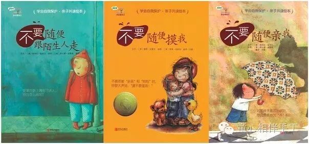 《不要随便跟陌生人走》、《不要随便亲我》、《不要随便摸我》这三本书教孩子在路上遇到陌生人该怎么办,面对不喜欢的亲吻要学会勇敢的说不,不喜欢被亲亲和抱抱时,要大声的说:“请不要碰我!”