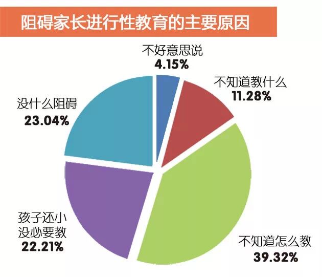 对于性教育,很多家长、大人都没有经验。调查显示,居然有39.32%的家长对性教育“不知道怎么教”,11.28%的家长“不知道教什么”,合计达到50.60%;另外,有22.21%家长认为“孩子还小,没必要教”,还有4.15%的家长“不好意思说”,合计达到26.36%。
