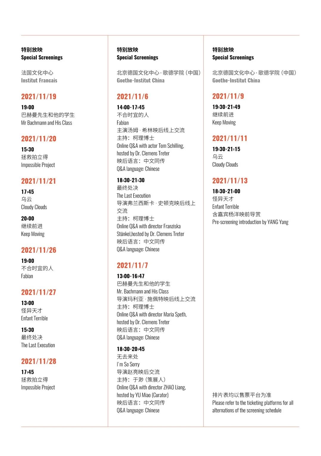 欢迎各位莅临2021年德国电影展。本届影展由德国电影协会主办,北京德国文化中心·歌德学院(中国)及百老汇影城共同协办。本届德国电影展,一如既往地为观众们带来了本年度在国际各大影展上广受好评的德国影片佳作。在这个文化交流尤为困难的时期,本届影展的举办,对于中国观众来说不啻为一个了解德国影片及演员的绝佳机会。虽然我们可能暂时无法在现实生活中进行面对面的交流,但我们依然很高兴能为大家呈现这一部部以多样的艺术手法进行叙事,连结着过去和现在的电影作品。我们十分自豪地为大家介绍由玛丽亚· 施拉德执导的影片《定制男友》,作为本届影展的开幕式影片。该片即将代表德国参加下一届奥斯卡最佳国际影片奖项的角逐。《定制男友》所探讨的,是一个人类认真爱上一个外表与人类相仿的人工智能的可能性,以及这在伦理道德上的合理性的命题。饰演该片主角的女演员玛伦·艾格特,凭借在本片中的表演,获得了柏林电影节银熊奖和德国电影奖 (也称劳拉奖) 最佳女演员奖项。同为劳拉奖得主的另一部影片《曲线球》则讲述了一个怪诞、甚至有些超现实的真实故事:即美国是如何基于假情报,在德国政府和德国特工部门的参与下,发动了伊拉克战争。在《无尽的核噩梦》中,我们可以了解到,即将在2022年放弃核电的德国,是如何面对核电所带来的问题。作为青少年特辑,我们非常自豪地为观众们介绍由艾琳·格灵执导的影片《妮可》。这部影片是本届关注德国影坛新人的电影节,马克斯·奥菲尔斯奖项的观众奖选择奖得主。自信而活泼的波斯裔德国姑娘妮可有着一份她所热爱的老人看护工作。她同她最好的朋友罗莎一起享受着柏林的夏天,可是一场突如其来的种族主义袭击,却撕碎了她那原本无忧无虑的日常生活。除了影展框架内的影片之外,北京德国文化中心·歌德学院(中国)还将同期举办一系列剧情片及纪录片的特别放映活动,你可以在线上问答的环节中与部分影片的导演及演员进行直接交流,这其中包括影片《不合时宜的人》中的主演汤姆·希林,该片由多米尼克·格拉夫执导,改编自埃里希·卡斯特纳的小说;除此之外,参与线上交流的还有纪录片《巴赫曼先生和他的学生》的导演玛利亚·施佩特,该片通过对一所德国学校的深入而感人至深的观察,反映了德国社会日益复杂的种族多样性社会议题,以及这所带来的所有机遇与挑战。相信在接下来的两周里,观众会在本次影展中不断发现精彩的影片,我们期待着与您的邂逅与交流!2021德国电影展宣传片本文奉上2021德国电影展全部信息时间安排+影院放映片单+特别放映+地址和购票信息文末还有赠票福利!手慢无,快转发起来吧~~