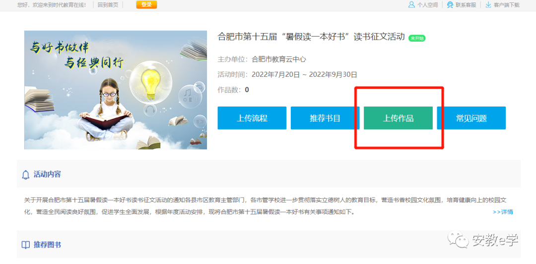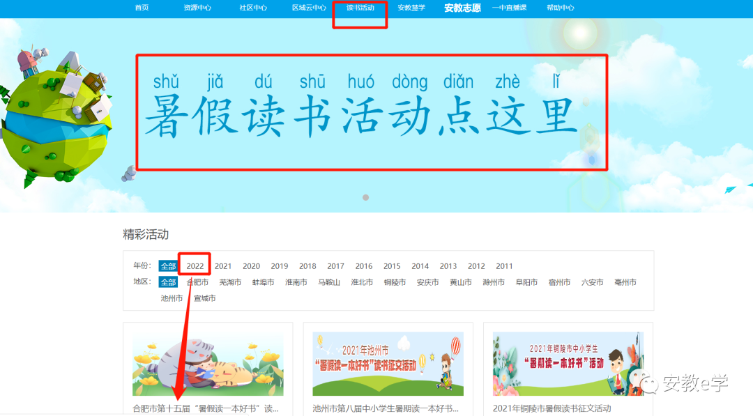 2.在首页找到“暑假读书征文活动”,点击图片进入活动专区,找到合肥市第十五届暑假读书活动。
