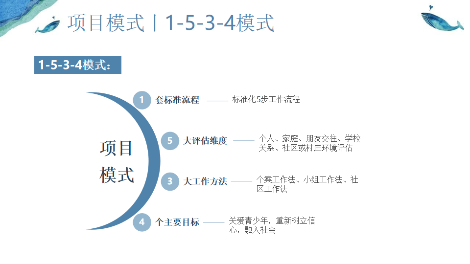 本项目按照“1-5-3-4模式”进行运作,即按照“1”套标准流程,使用“5”大评估方法对咨询对象进行评估,结合“3”大工作方法达到“4”个主要目标。其中“1套标准流程”指的是标准化5步工作流程,即接案、搜集资料评估需求、制定帮教计划、开展帮教活动、效果评估结案的工作流程。使用到的“5”大评估方法是对个人、家庭、朋友交往、学校关系、社区或村庄环境进行评估。而“3”大工作方法指的是个案工作法、小组工作法和社区工作法。本项目拟达到的“4”个主要目标是关爱青少年,重新树立信心,提高自我管理能力,提高适应能力融入社会。