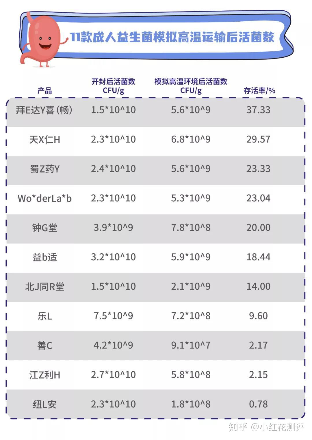 花爸设计了模拟快递货车车厢的高温环境(高温50℃,时间24h),检测各产品的活菌数、存活率。