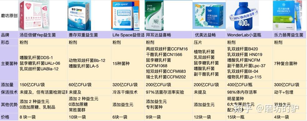关于怎么选益生菌,可以先看一张图,这些年吃下来,基本研究过市面上所有还不错的益生菌,但这些参数也只是基本的参数,具体还需要看菌种的有效性,后面会结合起来一起分析。其次价格我都是放的原价,可以对比下,但每家每个时候活动力度都不一样,所以还是要具体去看下活动价。