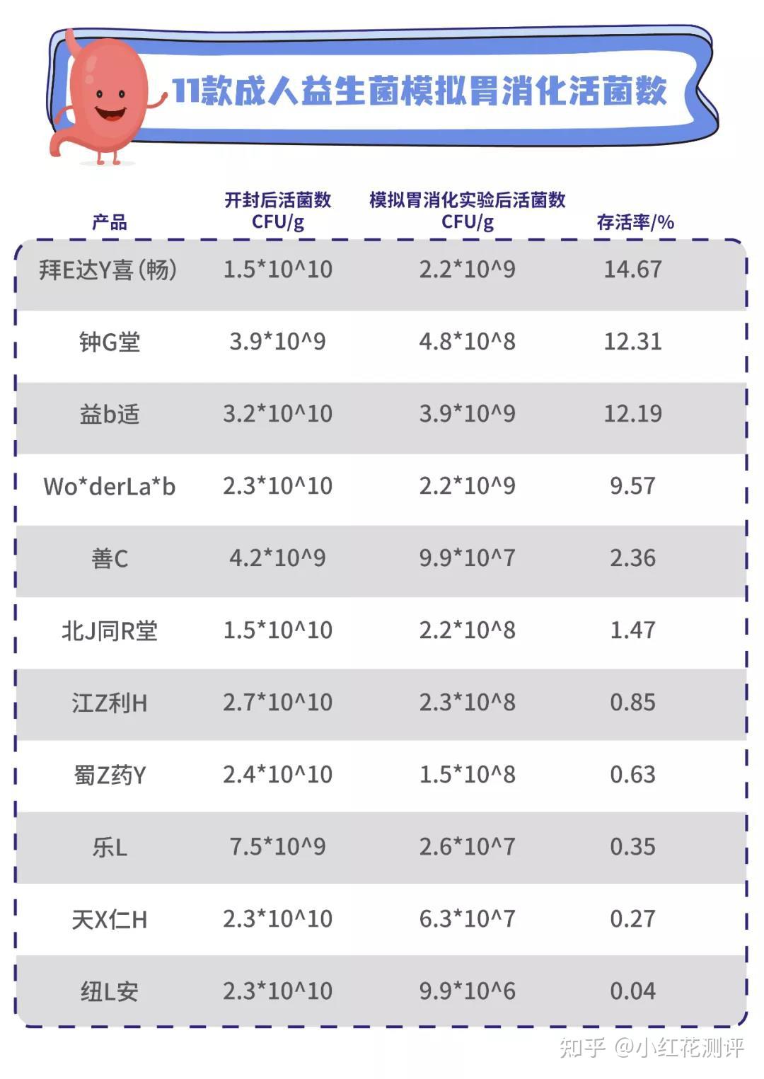 花爸设计了模拟胃消化的环境(产品经10倍稀释后,加入人工胃液,调整PH为3.0,37℃保温1.5h),检测各产品经过胃消化后的活菌数及存活率。