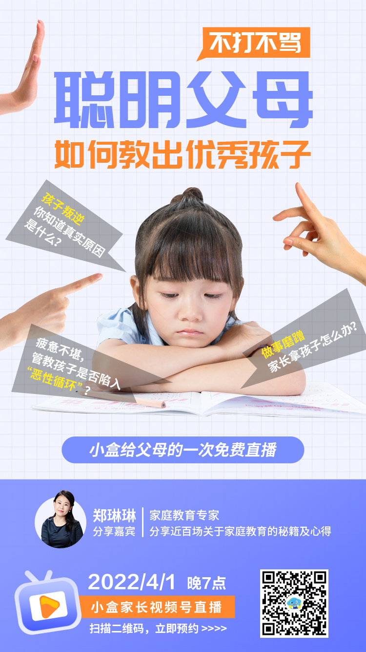 如果和孩子相处时,你总是忍不住吼骂孩子;如果你想走出管教孩子的误区,如果你想为孩子营造一个良好的家庭环境,让孩子成长为更优秀的人,那强烈推荐你预约本周五(4月1日)晚7点,小盒给所有父母的一场免费直播