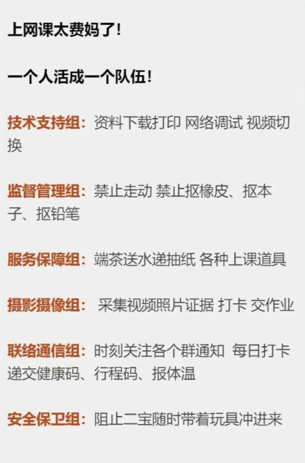 要是家里有两个孩子同时上网课,那还要练就“分身术”。 一边盯着老大乖乖上课,一边盯着老二别来捣乱,顺便还得打起精神处理自己的工作。 眼看开学返校还很遥远,可中年父母早已累瘫。