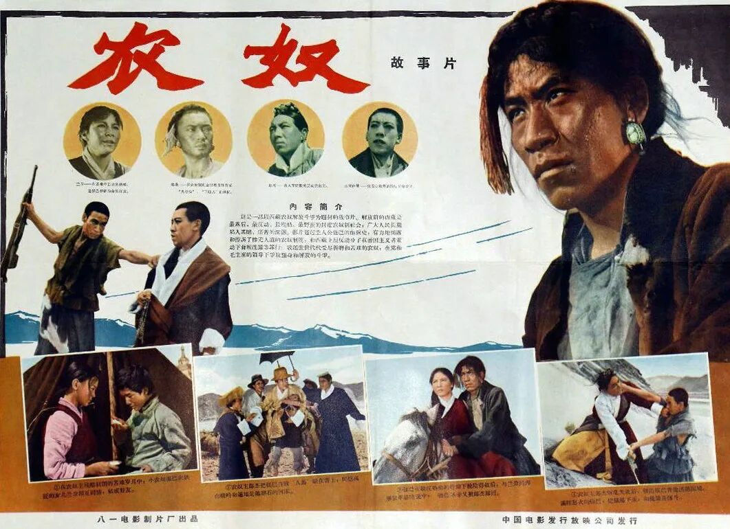 藏族题材电影在不同历史时期有不同的生产意义,新中国成立后到改革开放前的新中国电影“在题材的开掘和表现对象上得到了新的拓展,阶级与权力结构重新整合,过去受压迫和剥削的阶层翻身当家做了主人。电影作为一种媒介与意识形态工具,需要对这种现实生活的新秩序给予肯定与支持”6。而这一时段社会文化定位是以汉族为中心整合革命史、建设史,故藏族题材电影作为以汉语电影为主体的中国电影,其生产主要为宣教实效和教育功能服务。发轫时期的少数民族题材电影全部使用汉语普通话配音,7这个影像设置在新中国成立初的20世纪五六十年代有其必要性:统一的多民族国家,为了确保民族团结,必须先形成主体一致的共述形态,表达最广大人民的生活愿景。统一语言的使用的确能起到文化普及的作用,但民族语言和方言毕竟更加贴合母语的亲近心理状态,并且在文化场域日益丰富、多元、深层、活跃的社会现代化进程中,民族影像实践死守统一语言,似乎是借少数民族题材的视觉创作传达属于汉族人民的实际话语,必然遮蔽少数民族人民的部分深层心语,使其个体文化内部表达的死角和空白不断扩大。
