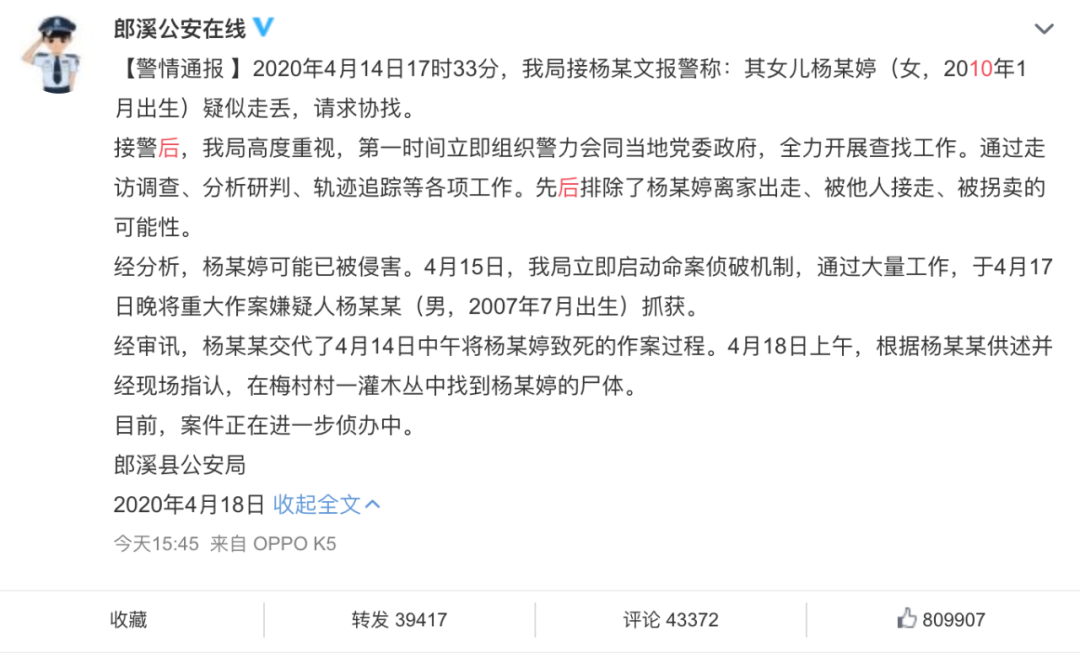 “安徽13岁男孩杀害10岁女孩后抛尸”