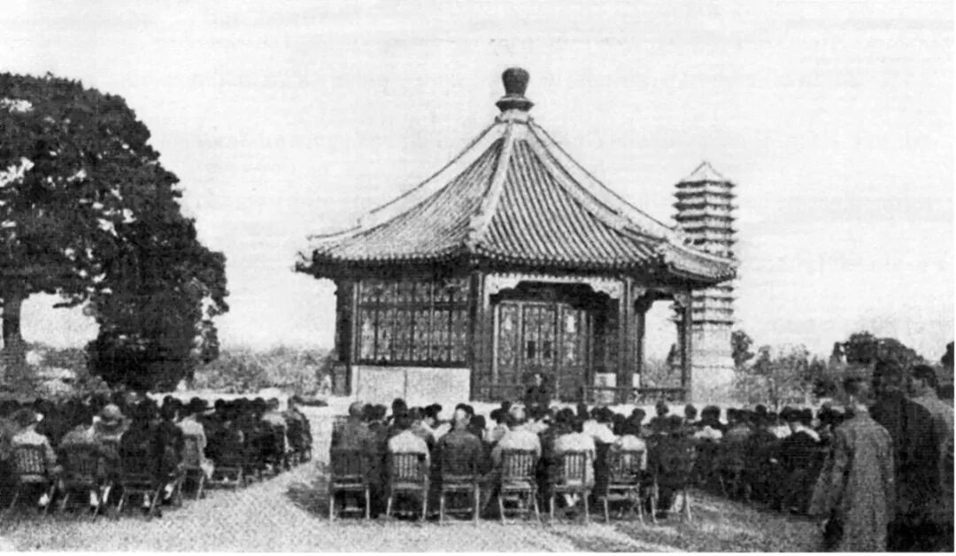未名湖中那个曾寄托着和珅“蓬岛瑶台”遐想的湖心小岛,无论是茂飞原先设计的拼贴式的中国小园——斯克兰顿-路思社交岛,还是今天北大对它的使用都不强调“通达性”,但在燕京大学时代,在这个作为全校社会活动中心的小岛上,我们看到的却是另外一番景象:最终岛上建成的主要建筑, 只有一座以路思家族命名的“思义亭”,亭前是一块开敞空地,几十排椅子摆在那里,可以轻松容纳一个中小型的集会,可以供全校师生就餐,甚至还可以作为露天“课堂” 的所在——比如燕京大学国剧社等一些社团的活动都在岛上进行,校方曾经请来人称“侗五爷”的傅侗,也就是治贝子园的前主人,在燕大教授昆曲的选修课,授课地点也设在岛亭。
