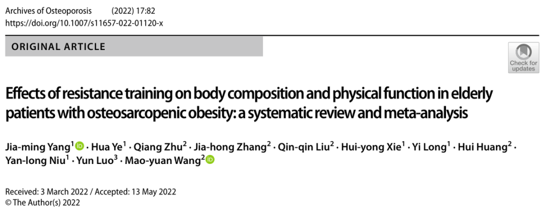 根据2022年1月发表在国外《Archives of Osteoporosis》期刊的一项系统性回顾研究成果:抗阻训练可以改善骨肌肉减少性肥胖症患者的骨矿物质密度、骨骼肌质量和体脂百分比。而且这种效果受到抗阻训练强度的影响:强度越高,效果越好。