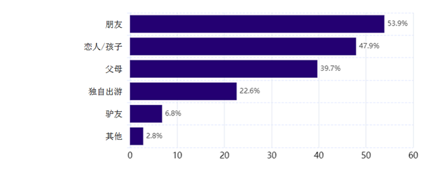 Z世代喜欢和朋友、恋人/孩子、父母一起出去旅游,但也有23%的Z世代会选择一个人独自出游。