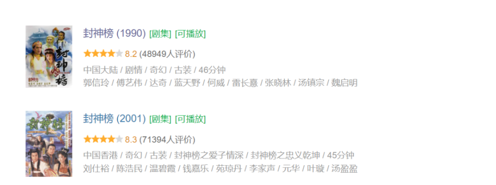 《封神》虽然是一个在中国乃至世界范围内都极具认同感、延展性的IP与文化符号,但是又仿佛有“扑街魔咒”一般,目前拍摄的直接以《封神榜》及其相关叙事命名的电影、电视剧中,只有1990年郭信玲拍摄,傅艺伟、蓝天野等人饰演的老版《封神榜》电视剧和2001年香港刘仕裕拍摄,陈浩民、温碧霞等人饰演的《封神榜》电视剧在豆瓣评分超过8分。