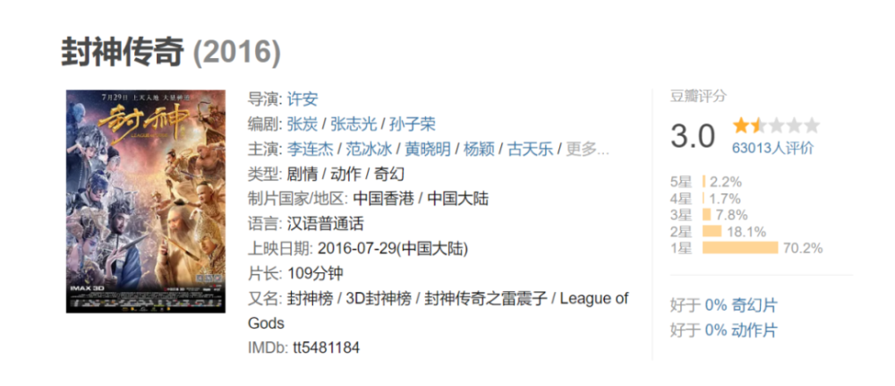 其他的《封神》作品,尤其是电影几乎一律扑街,甚至出现了2.8分、3.3分之类的超低评分。2016年同样是巨星云集的许安版,李连杰、古天乐等举行加盟的《封神传奇》电影也是以3.0分的超低分惨淡收场。