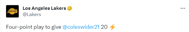 下半场,斯威德第三节站在底角,接球后迎着防守打成3+1,如此一球点燃湖人替补席,克里斯蒂等人为他庆祝,之后斯威德又中三分,不过湖人第三节被快船反超。