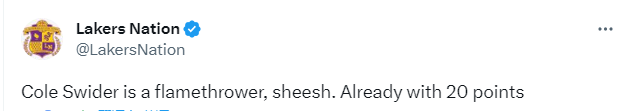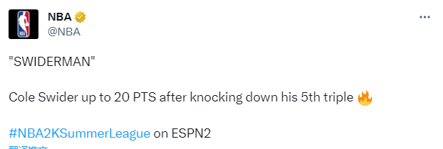 湖人官方晒斯威德3+1打4分的精彩时刻,NBA官方晒斯威德投进第5记三分,称其为“SWIDERMAN”;美媒表示?科尔-斯威德是一名火焰喷射器,天啊,他已经有20分了。