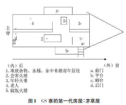 依据村寨中老人的描述以及保留在村寨中的一两栋茅草屋可知,20世纪40年代搬迁到GS的景颇村民们依山就势,按照景颇传统房屋样式,用竹子、木头与茅草作为材料搭建自己的家(见图1)。竹屋下层架空1至2米作为养鸡、猪家畜的地方,整个竹屋成纵深式长屋短檐样式,屋面成长方形,屋内一条长长的屋脊将房屋空间划分为两个部分。