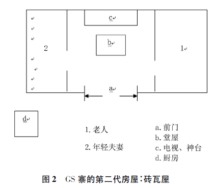 20世纪七八十年代,草屋贫穷落后不卫生的意向,加之茅草不好找等因素,GS开始模仿汉族村落建盖砖瓦落地式房屋(见图2) ,村民ZMD是最早一批盖起砖瓦房的景颇人家,他下山时看到汉人居住的砖瓦房,于是将房屋样子记在心里,回去后便买来泥砖开始自己模仿建盖,至今,他都在为自己建房技艺自豪不已。不过,此横向落地式房屋结构在改变景颇传统长屋纵深式空间的同时,也逐渐消解与淡化了家庭中性别、长幼的亲属伦理。