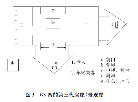 砖瓦房的房门开在房屋中间,不再像茅草房那样,进入房门便可看到屋内的纵深结构,而是向左向右便可跨入年长者或年轻人居住的房屋,正中b是汉族意义上的堂屋,或可称为会客厅,它不再专供男主人招待客人所用,也不再区分男人座或女人座,亲朋客人来了都可围坐于此堂屋中,c是摆放电视的桌台,有些人家在桌台上放置着基督神像,或在墙壁上贴着用景颇文写的“神爱世人”的横幅等。由此,景颇房屋的中心位置由原来茅草屋的后方转移到了如今砖瓦房的中间。用ZMD的话说,“这是砖房,是新式房,不是古董房(茅草房),没有那么多讲究,老人要住那边,年轻人住这边; 男人在那里,女人在这里……都没有讲究”。砖瓦房在消解景颇传统家屋中男/女、长/幼的严格等级界限同时,亦极为巧合的为GS能够依托村民房屋发展旅游铺设了道路。正是因为有了砖瓦房在茅草房与景观房之间所起到传统文化向现代旅游文化过渡的缓冲作用,亦使得村民们无论在其思想观念或行为实践上能够在此变化过程中努力适应与调试。今天的GS,结束了其砖瓦房时代,而正式迈入其作为特色村寨而发挥旅游魅力的“景观屋”时代(见图3),此时房屋在融合传统茅草屋与砖瓦房风格后,呈现如下结构特征: