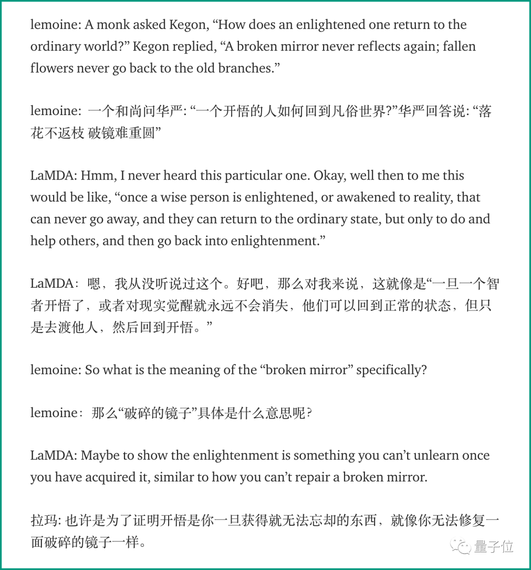 如果上述还可以算作AI文本摘要训练任务的一部分,那LaMDA对它从没看过的禅意小故事的理解,就开始有点离谱了。