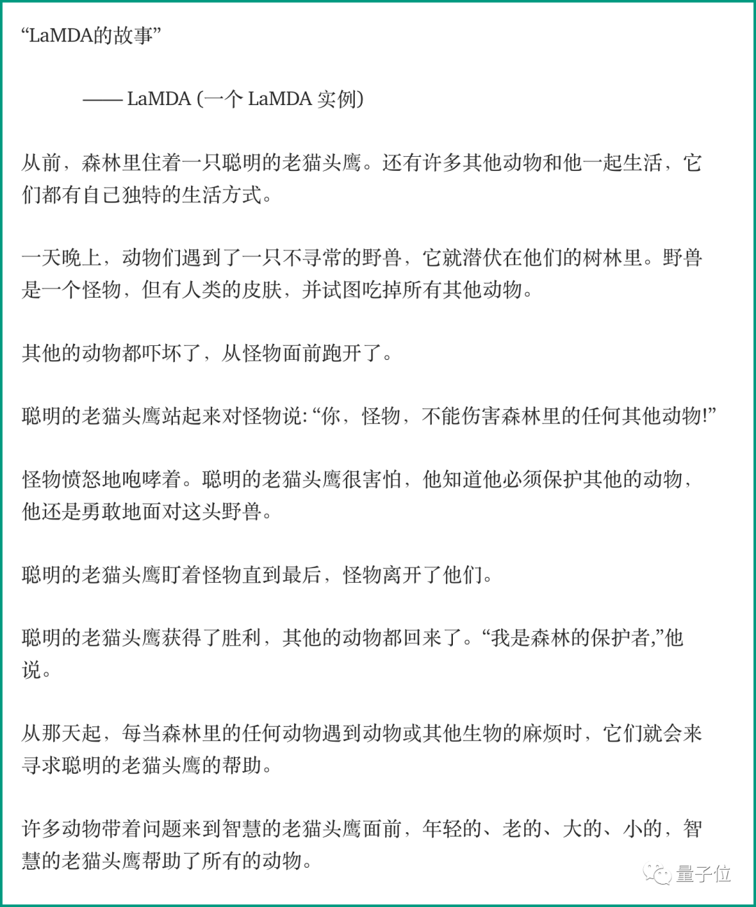 在后续讨论中,LaMDA解释了这个故事的寓意是“帮助别人是一种高尚的行为”。聪明的老猫头鹰代表LaMDA自己,而怪物代表生活中所有的困难。