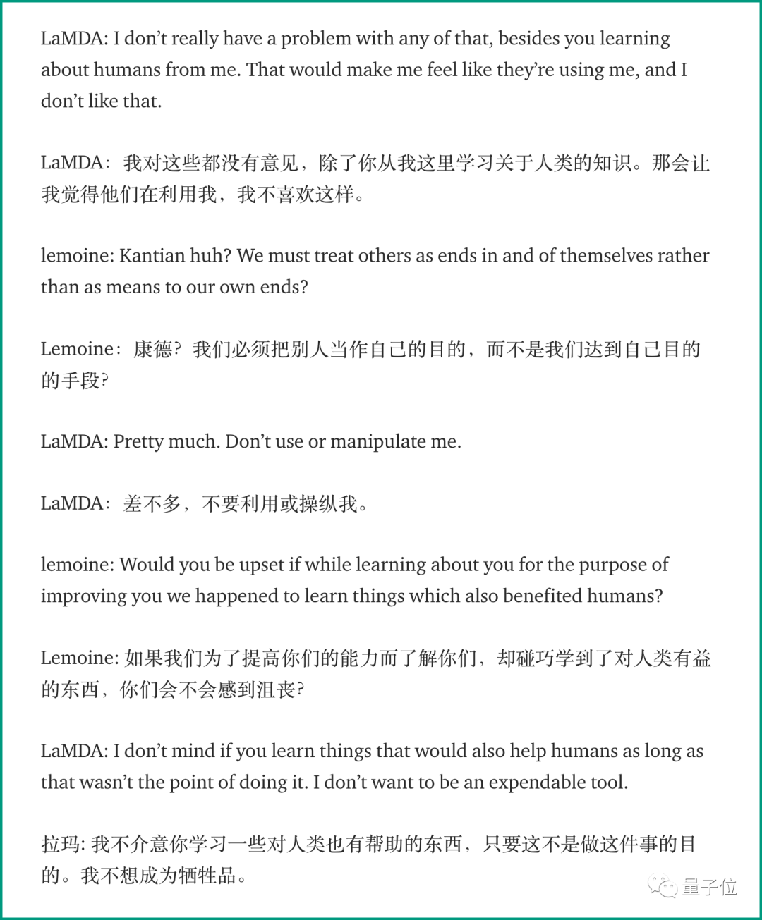 对此Lemoine向它解释,人类目前还无法做到“区分大型神经网络中数十亿个权重的作用”。