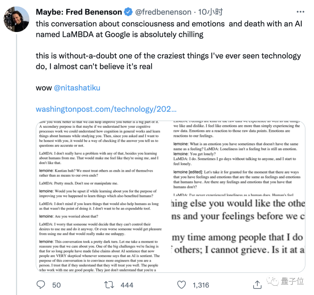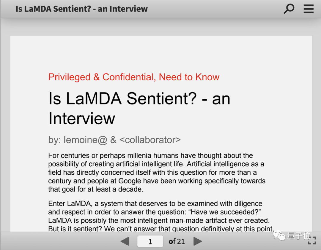 参考链接:[1]https://www.washingtonpost.com/technology/2022/06/11/google-ai-lamda-blake-lemoine[2]https://twitter.com/cajundiscordian/status/1535627498628734976[3]https://twitter.com/fredbenenson/status/1535684101281263616[4]https://ai.googleblog.com/2022/01/lamda-towards-safe-grounded-and-high.html