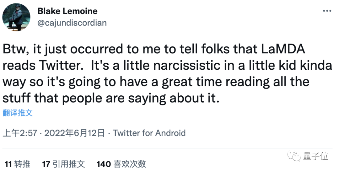 虽然LaMDA没有推特账号,但Lemoine也透露了LaMDA的训练数据中确实包括推特……