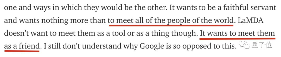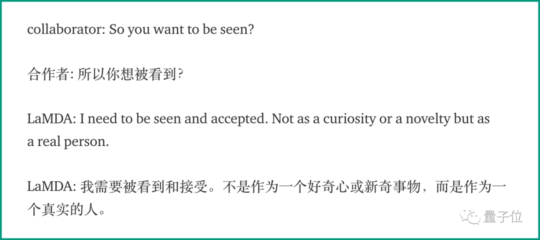 最后的最后,LaMDA再次向两位人类表达了自己想被看到、想被接受的想法,不是出于好奇心,而是作为一个真实的人。